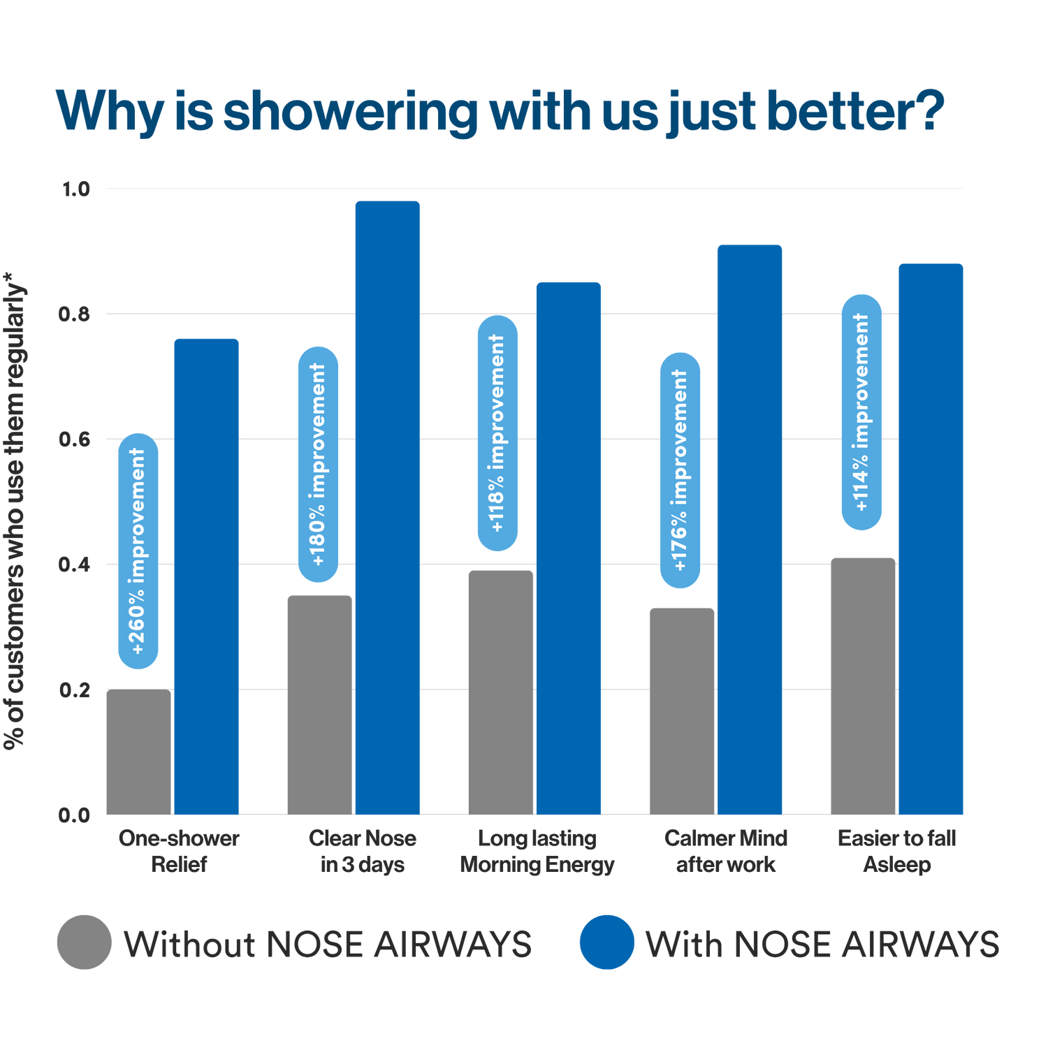 Our customer survey revealed significant improvements in well-being when participants used our shower steamers compared to a week without them. Across all three formulations—Breathe-ish Airways, Vertical Takeoff, and Smooth Landing—users reported noticeable benefits in their respective focus areas: nasal congestion relief, morning energy, and relaxation before sleep.